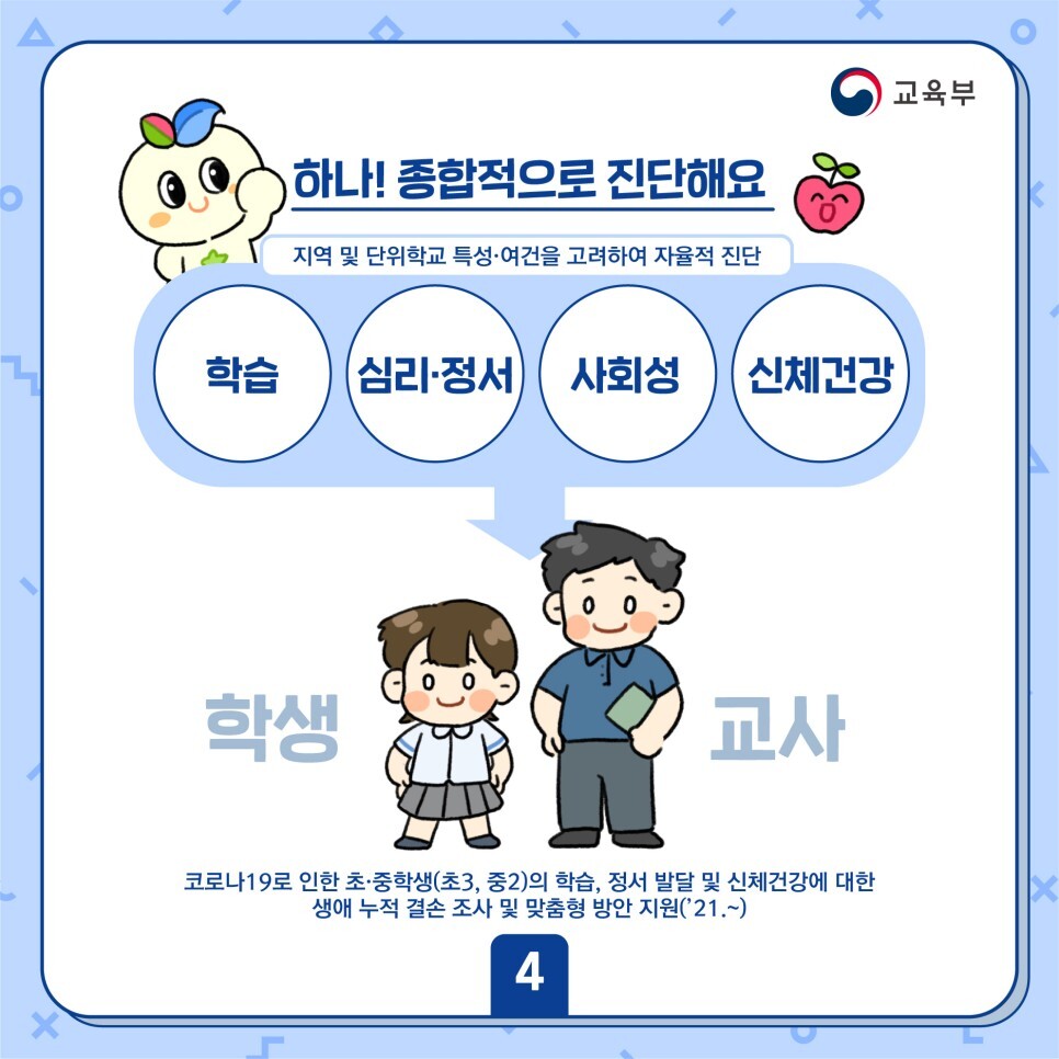 ✔ 학생과 교사의 학습, 심리•정서, 사회성, 신체건강을 지역 및 단위학교 특성•여건을 고려하여 자율적 진단