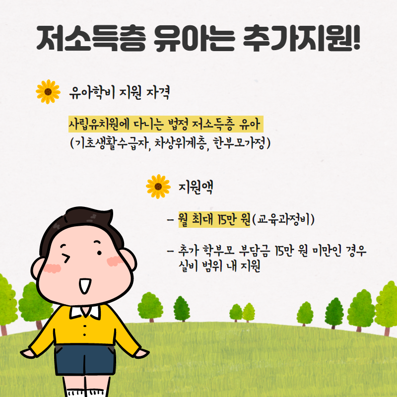 사립유치원에 다니는 법정저소득 유아에게는 유아학비에 추가적으로 지원금이 15만 원이 더 지급이 되는데요. 기초생활수급자, 차상위계층, 한부모가정이 이에 해당됩니다. 그리고 추가 학부모 부담금이 150,000원 미만이면 실비 범위 내에서 지원되고 있습니다. 경제적 어려움으로 인해 교육받기 힘든 가정을 위한 지원 정책이 있었으면 좋겠다는 생각을 가졌는데 추가적으로 이렇게 소외된 부분을 채워줄 수 있는 지원 정책이 있어 더욱 든든한 것 같습니다.