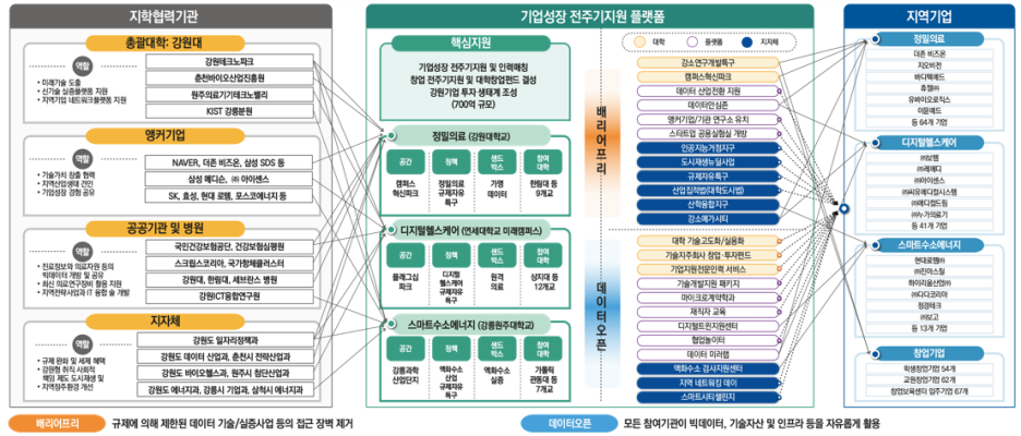 또한 산(산업계)-학(대학)-연(연구소)-병(병원)-관(지자체)의 협업체계를 구축하고 규제자유특구* 등 정책과 연계하여 핵심분야 기업을 대상으로 ‘인재양성-기술개발-기업지원-창업지원’의 전주기적 성장을 지원한다.