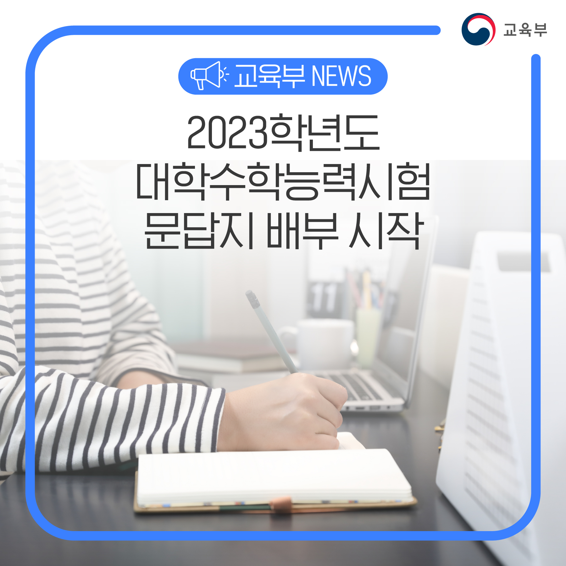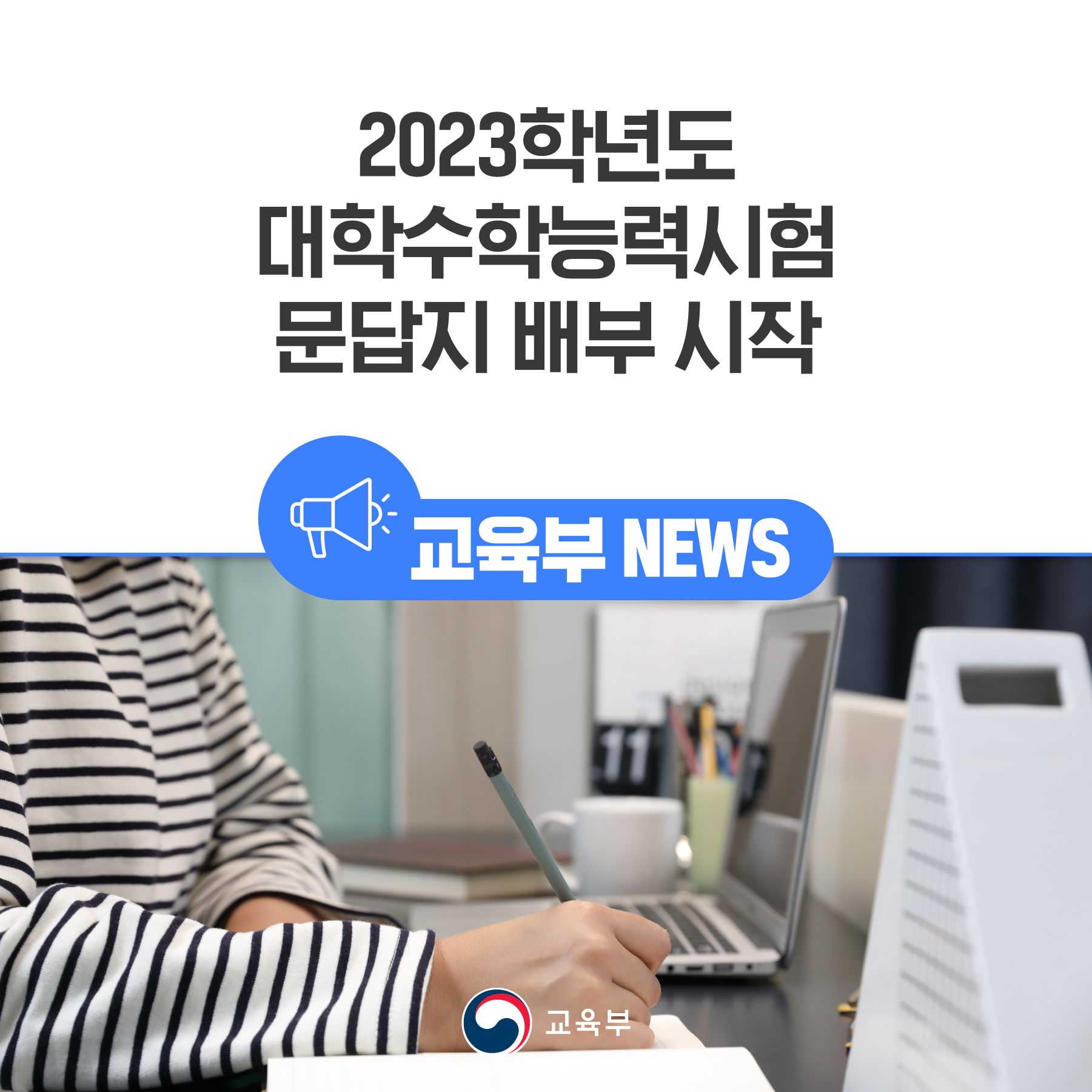교육부(부총리 겸 교육부장관 이주호)는 11월 14일(월)부터 11월 16일(수)까지 2023학년도 대학수학능력시험(이하 수능) 문제지와 답안지를 전국 84개 시험 지구에 배부한다.