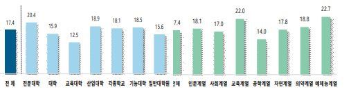 (계열별) 계열별로는 예체능계열 22.7%, 교육계열 22.0%, 의약계열 18.8%, 인문계열 18.1%, 자연계열 17.8% 등의 순으로 나타났다.