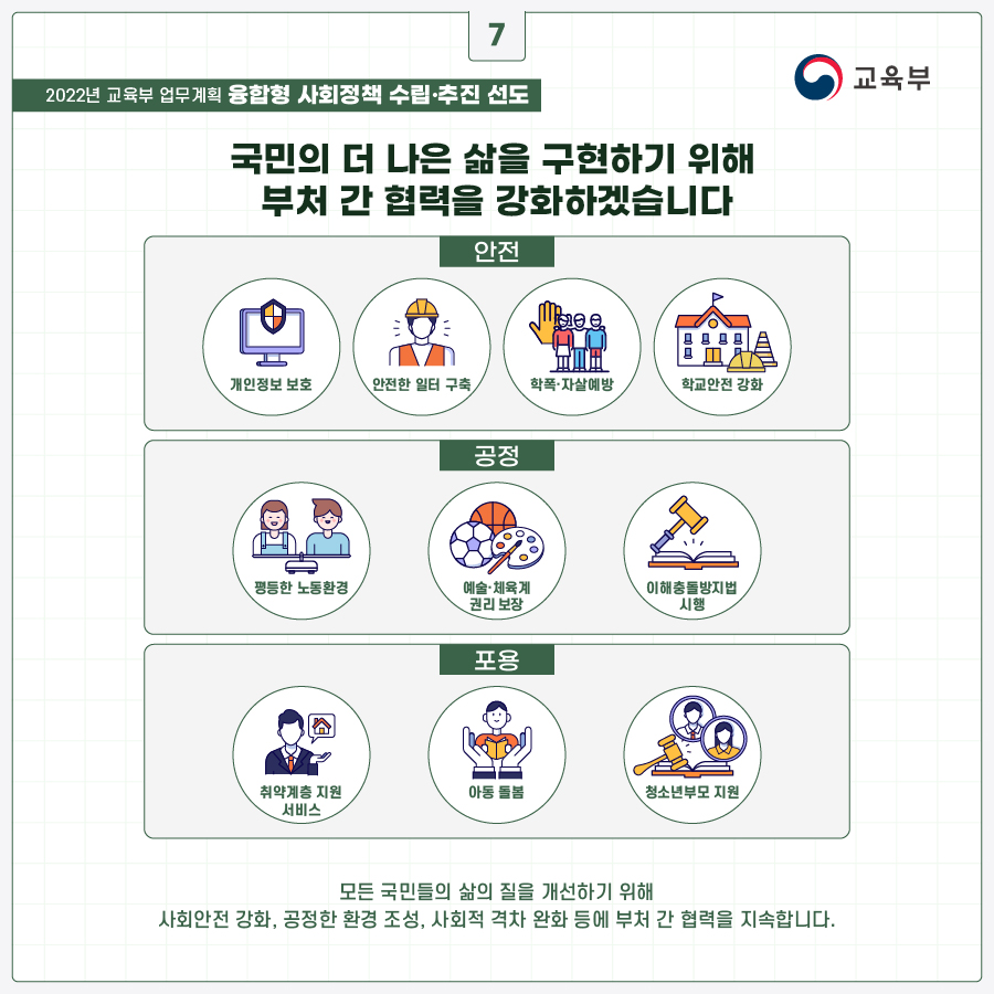 2022년 교육부 업무계획, "모두의 더 나은 삶을 위해" 부처 간 긴밀한 협력을 통해 신뢰받는 포용사회를 구현하겠습니다.