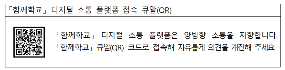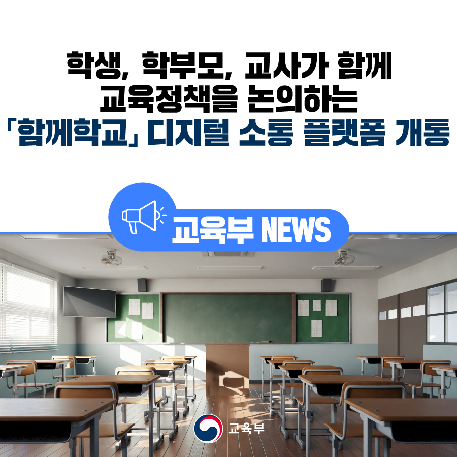 「함께학교」 디지털 소통 플랫폼은 교육 3주체(학생, 학부모, 교사)가 함께 교육정책을 논의할 수 있는 온라인 소통 공간으로, 교육정책에 현장의 목소리를 적극 반영하기 위해 매주 진행되는 ‘현장 교사와 부총리가 함께 만드는 교육정책’에 이어 마련되었으며, 이를 통해 현장과 정책 부서 간 소통이 확대될 것으로 기대된다.