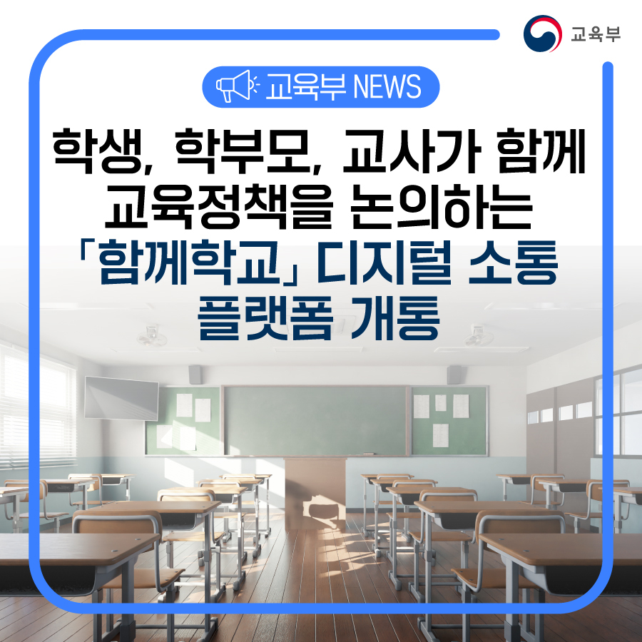 교육부(부총리 겸 교육부장관 이주호)는 11월 20일(월), 「함께학교」 디지털 소통 플랫폼을 개통한다고 발표한다.