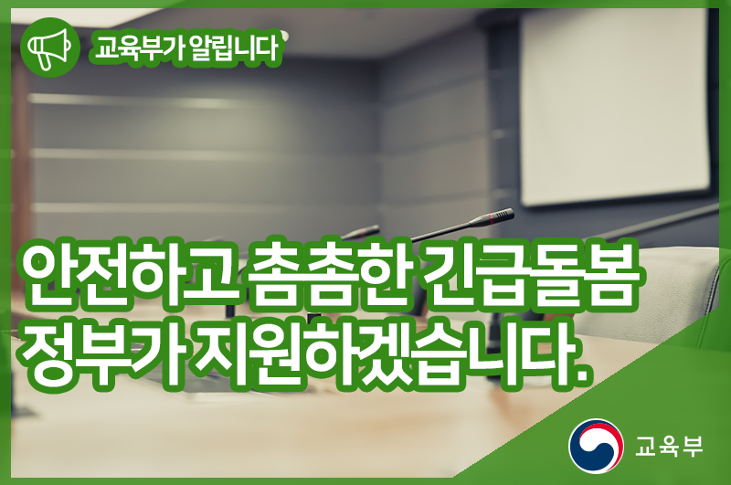 교육부, 보건복지부, 고용노동부, 여성가족부는 함께 협력하여 코로나바이러스감염증-19(이하, “코로나 19”) 예방 및 확산 방지를 위한 개학 연기 후속조치의 일환으로 어린이집, 유치원, 초등학교의 휴업 기간 동안 안심하고 자녀를 맡길 수 있는 긴급돌봄을 제공한다.