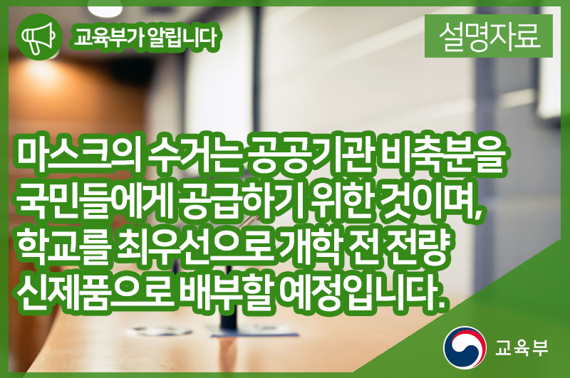 대한민국 교육부 2020. 3. 1. 23:27마스크의 수거는 공공기관 비축분을 국민들에게 공급하기 위한 것이며, 학교를 최우선으로 개학 전 전량 신제품으로 배부할 예정입니다.