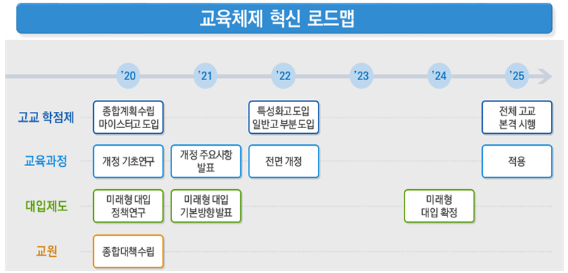 2019년 마련한 교육 공정성 강화 정책을 현장에 안착시키고, 체감할 수 있는 변화를 창출하여 교육에 대한 국민 신뢰를 회복한다. 서열화 된 고교교육 체제를 일반고 중심으로 개편하기 위해 ’25년 고교학점제 도입에 맞춰 자사고‧외고‧국제고를 일반고로 전환하는 한편, 학생부종합전형의 신뢰성을 높이고 대입제도의 공정성을 제고하기 위한 노력도 계속한다.