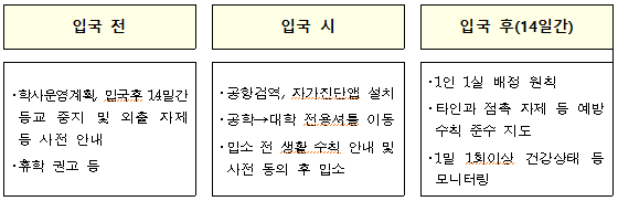 ① (입국 전) 대학은 중국에서 입국하는 유학생에 대해 학사운영계획과 입국 후 14일간 등교가 중지되며 외출을 자제하여야 함을 사전에 안내하고, 필요시 휴학도 권고한다.