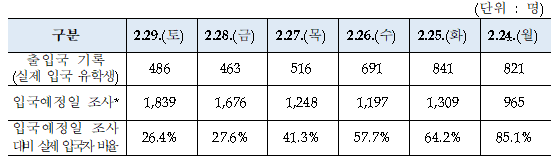 ㅇ 당초 집중 입국기간으로 예상되었던 지난주 2.24.(월) ~ 2.29.(토) 동안의 입국인원은 3,818명으로 당초 예상했던 8,234명보다 대폭 감소하였으며, 특히, 2월29일에는 486명이 입국하여 당초 대학을 대상으로 조사한 결과인 1,839명의 26% 수준에 그쳤다.