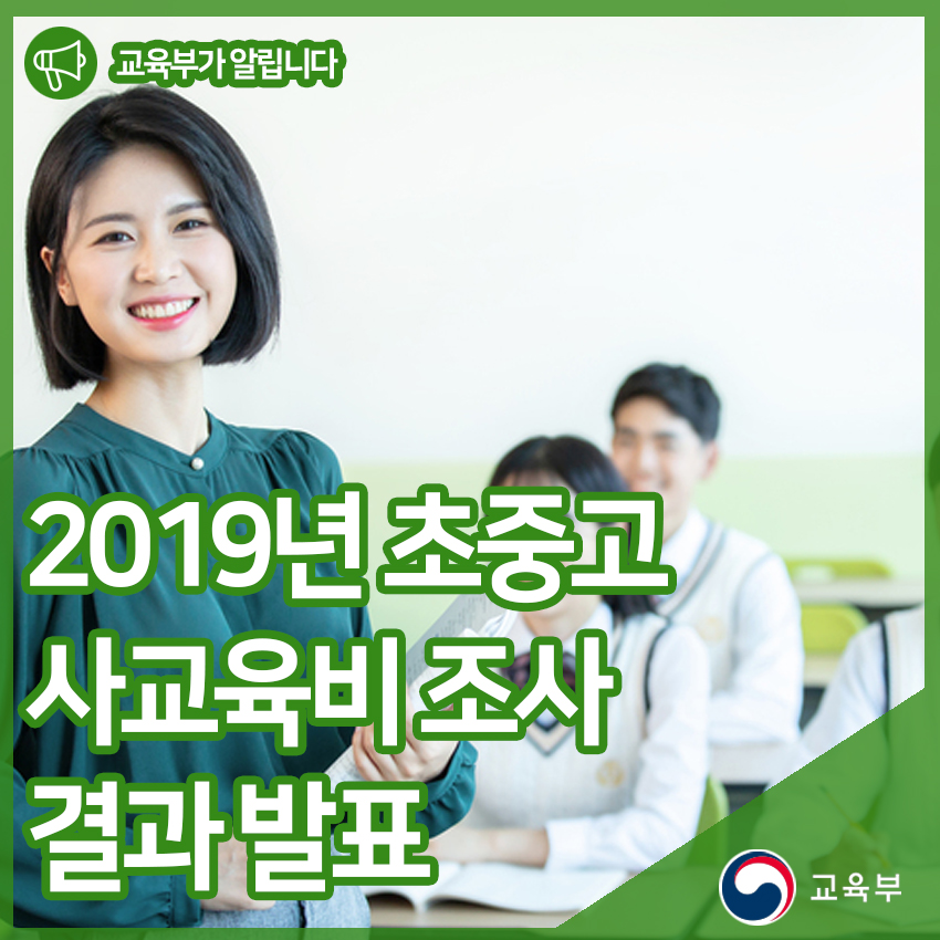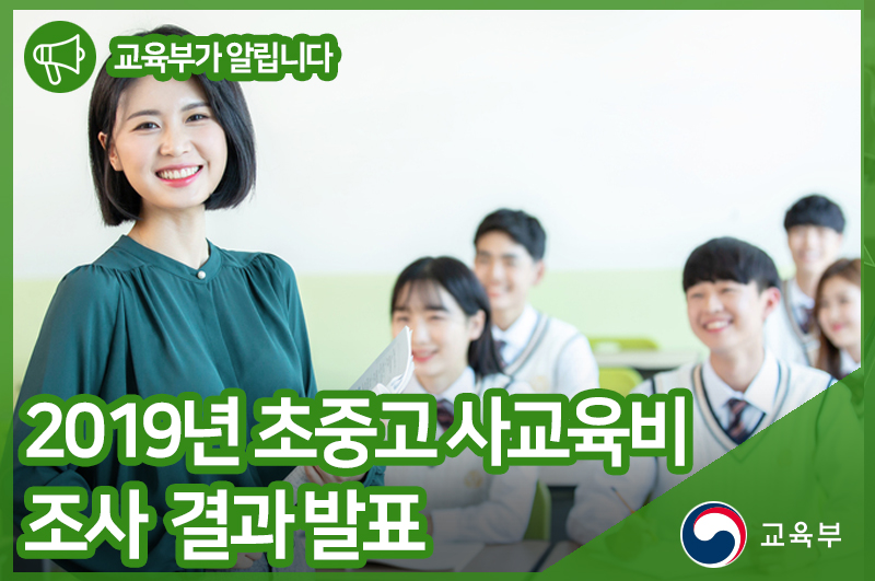 교육부(부총리 겸 교육부장관 유은혜)는 통계청(통계청장 강신욱)과 공동으로 실시한 「2019년 초중고 사교육비조사」 결과를 3월 10일(화)에 발표했다. 이번 조사 결과는 2019년 3~5월과 7~9월에 지출한 사교육비 및 관련 교육비를5~6월과 9~10월에 전국 초중고 3,002개교 학부모 8만여 명(학급 담임 및 방과후 교사 포함)을 대상으로 조사한 내용을 분석한 것이다.
