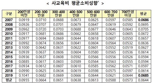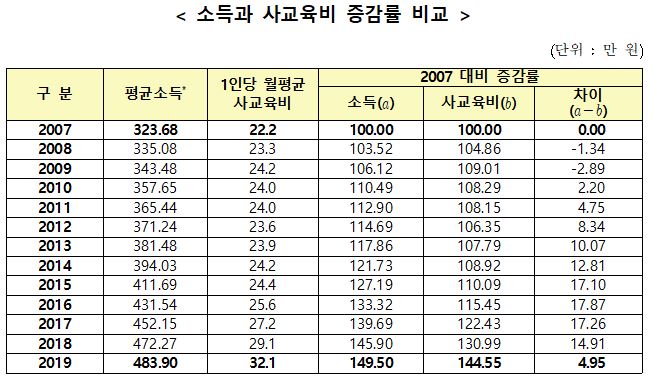 한편, 소득 중에서 학생 1인당 사교육비가 차지하는 비중은 2007년 대비 2019년에 큰 변화가 없다는 것을 볼 수 있으며, 소득증가율과 사교육비 증가율을 비교해보면 2007년 대비 2019년의 사교육비는 소득증가분만큼 늘어나지는 않았다.