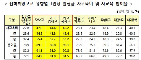 진학희망고등학교 유형별로 학생 1인당 월평균 사교육비를 보면, 초등학생, 중학생 모두 일반고에 비해서 자사고, 특목고 진학을 희망할수록 더 많은 금액을 지출하는 것으로 나타났으며, 사교육 참여율도 높은 것으로 나타났다.
