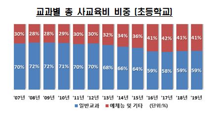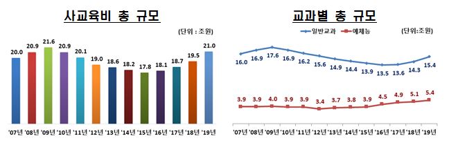 2019년 사교육비 총액은 약 21조 원으로, 2018년 19조 5천억 원 대비 1.5조 원(↑7.8%) 증가하였다. 교과 사교육비 총액은 15조 4천억 원으로 전년(14조 3천억 원) 대비 1조 1천억 원(↑8.0%) 증가하였고, 이 중 국어는 1조 5천억 원(↑8.4%), 영어 6조 1천억 (↑8.2%), 수학5조 9천억 원(↑6.2%)이었다. 예체능*및 취미·교양**등은 5조 4천억 원으로 전년(5조 1천억 원) 대비 3천6백억 원 증가(↑7.0%)하였고, 이 중 음악은 1조 8천억 원(↑8.4%), 미술9천억 원(↑4.6%), 체육2조 3천억 원(↑9.1%)이었다.