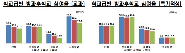 2019년 방과후학교 참여율(유상+무상)은 48.4%로 전년(51.0%) 대비2.5%p 하락하였다. 세부적으로 교과 프로그램의 경우 전체 참여율31.2%로 전년(33.8%) 대비 2.6%p하락하였고, 모든 학교급에서 하락하였다. 한편, 특기적성 프로그램의 경우전체 참여율28.2%로전년(27.5%) 대비 0.7%p상승하였고, 중학교에서만 하락하였다.