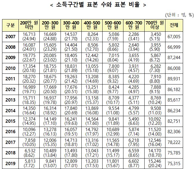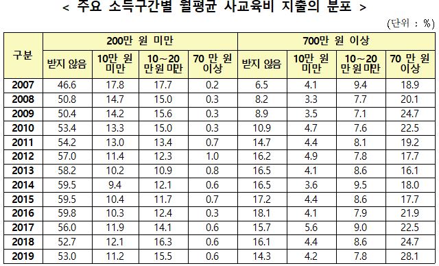 교육부와 통계청이 현재와 같은 방식으로 사교육비 조사를 실시한 2007년 이후부터 소득과 사교육비의 관계에 대해서 분석한 결과, 소득과 사교육비는 밀접한 관련이 있음을 알 수 있다.연도별 사교육비 조사 표본의 소득별 분포를 비교해보면 200만 원 미만의 경우 2007년 대비 2019년이 1/3 수준으로 떨어진 반면, 700만 원 이상의 경우 2007년 대비 2019년에 4배 정도로 증가한 것을 볼 수 있다.
