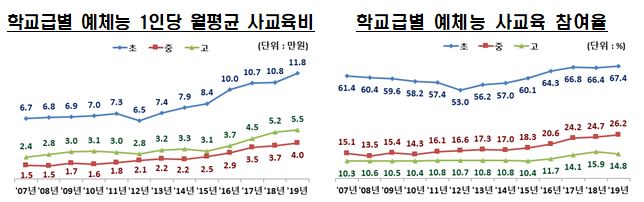또한, 초등학생의 경우 타 학교급에 비해서 예체능 및 취미‧교양 사교육 참여율이 높고,학생 1인당 월평균 사교육비도 가장 큰 것으로 나타났으며,