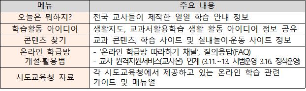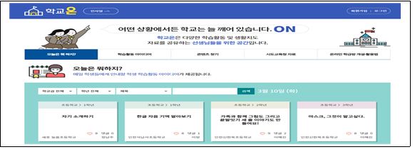 이에 교사가 온라인 학급방을 개설하고 학습 및 생활 지도 등의 가정학습을 지원하는데 필요한 정보를 쉽게 찾을 수 있는 온라인 학습 통합 지원 누리집(플랫폼)‘학교온(On)’*을 개통하였다. ‘학교온(On)’에는전국의 선생님들이 자발적으로 제작한 일일 학습 안내 정보(관련 자료 링크 포함)인 “오늘은 뭐하지?”가 학년별 교과별로 제안되어 있다. 교과 콘텐츠 외에도 지난 부총리 주재 사회관계장관회의(3.6.) 시 논의된 문화예술·안전·인문 분야 등 타 부처가 보유하고 있는 콘텐츠도협력·연계하여 종합적으로 제공한다. 또한, 각 시도교육청에서 제공하고 있는 온라인 학습 관련 정보 및 온라인 학급 운영에 필요한 서비스 활용법도 확인 가능하다.
