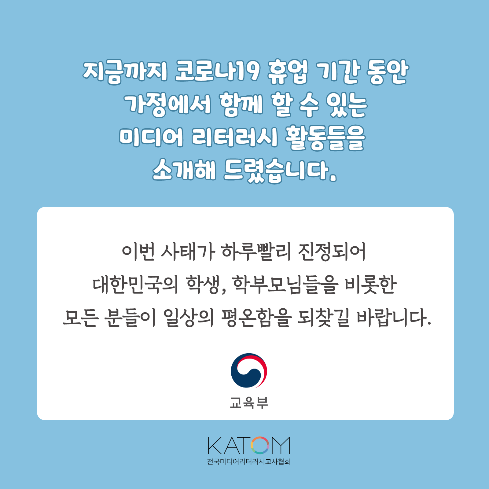 지금까지 코로나19 휴업 기간 동안 가정에서 함께 할 수 있는 미디어 리터러시 활동들을 소개해 드렸습니다.
