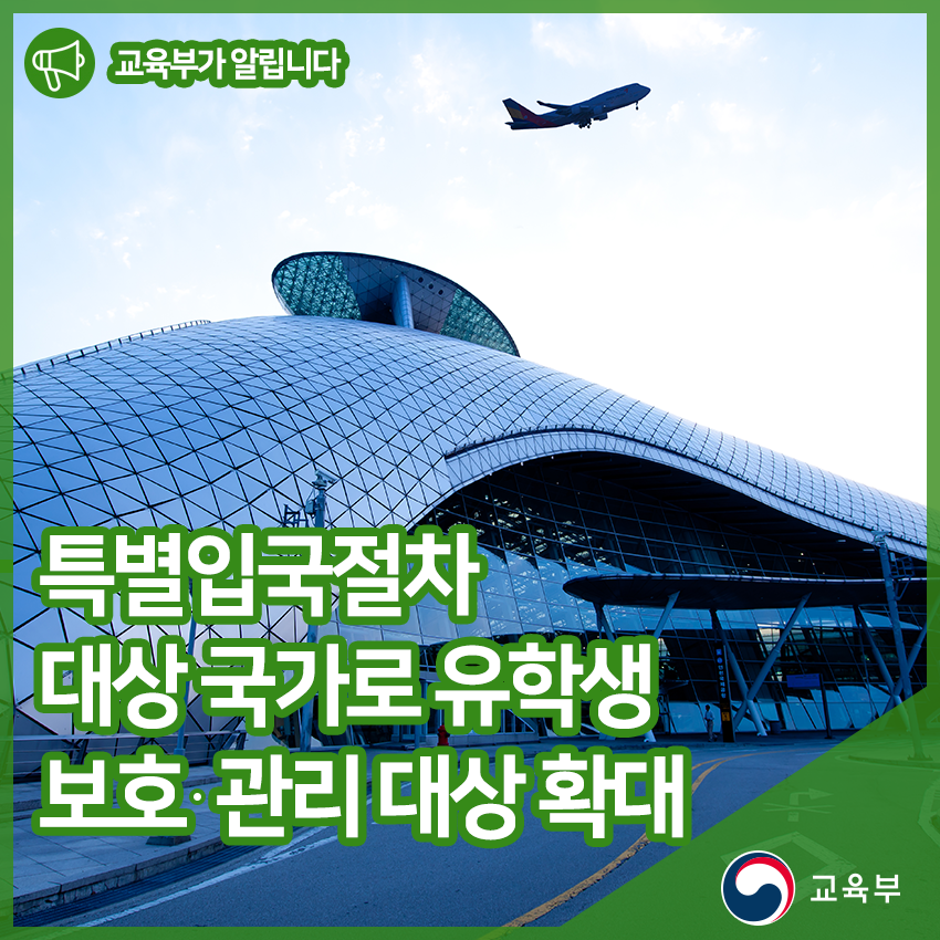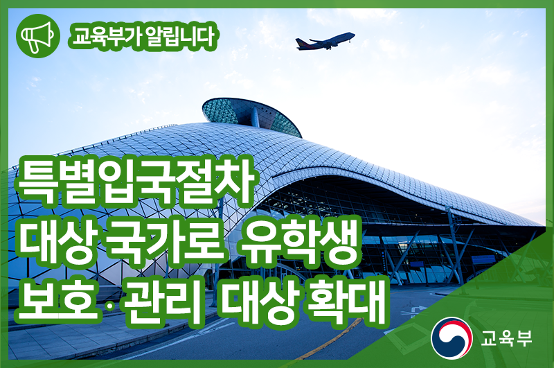 교육부(부총리 겸 교육부장관 유은혜)는 중국 유학생에게 적용하였던 보호‧관리 방안을 특별입국절차를 적용하는 국가로 확대하기로 하였다.