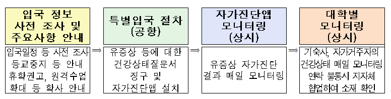 최근 유럽 등 세계전역으로 코로나19가 확산됨에 따라 정부는 특별입국 절차 적용 대상 국가를 기존 중국(2.4~)에서부터 홍콩‧마카오(2.12~), 일본(3.9~), 이탈리아‧이란(3.12~)까지 지속 확대하였으며, 3월 15일부터는 프랑스, 독일, 스페인, 영국, 네덜란드 총 5개 가로 확대할 예정이다. 이에 교육부는 국내‧외 학생의 건강 보호와 안정적 학업여건 조성을 위해 입국 단계별로 원격수업 확대 등을 포함한 학사 주요사항 사전공지, 특별입국절차를 통한 검역 강화, 등교중지(14일) 및 건강상태 모니터링 등 유학생 보호‧관리 조치를 특별입국절차를 적용하는 국가의 유학생에게 확대‧적용하기로 하였다.