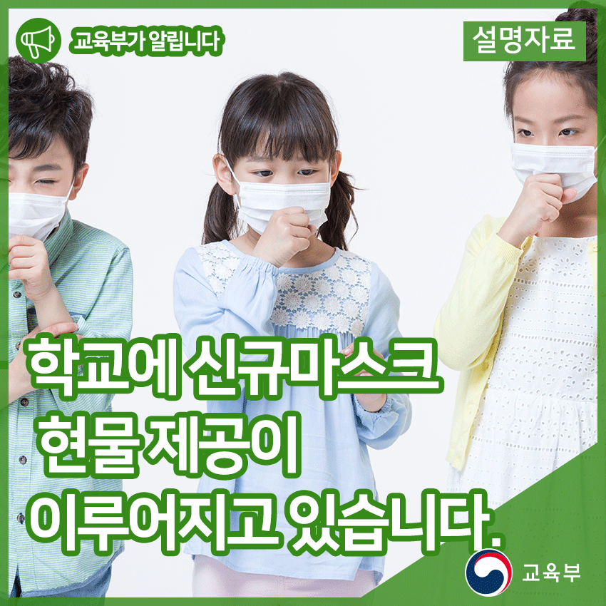 교육부는 현재 신학기 준비에 필요한 마스크 확보를 위해 정부 부처 간 협의를 진행하고 있습니다. 또한 학교에 신규마스크 현물 제공이 이루어지고 있습니다.