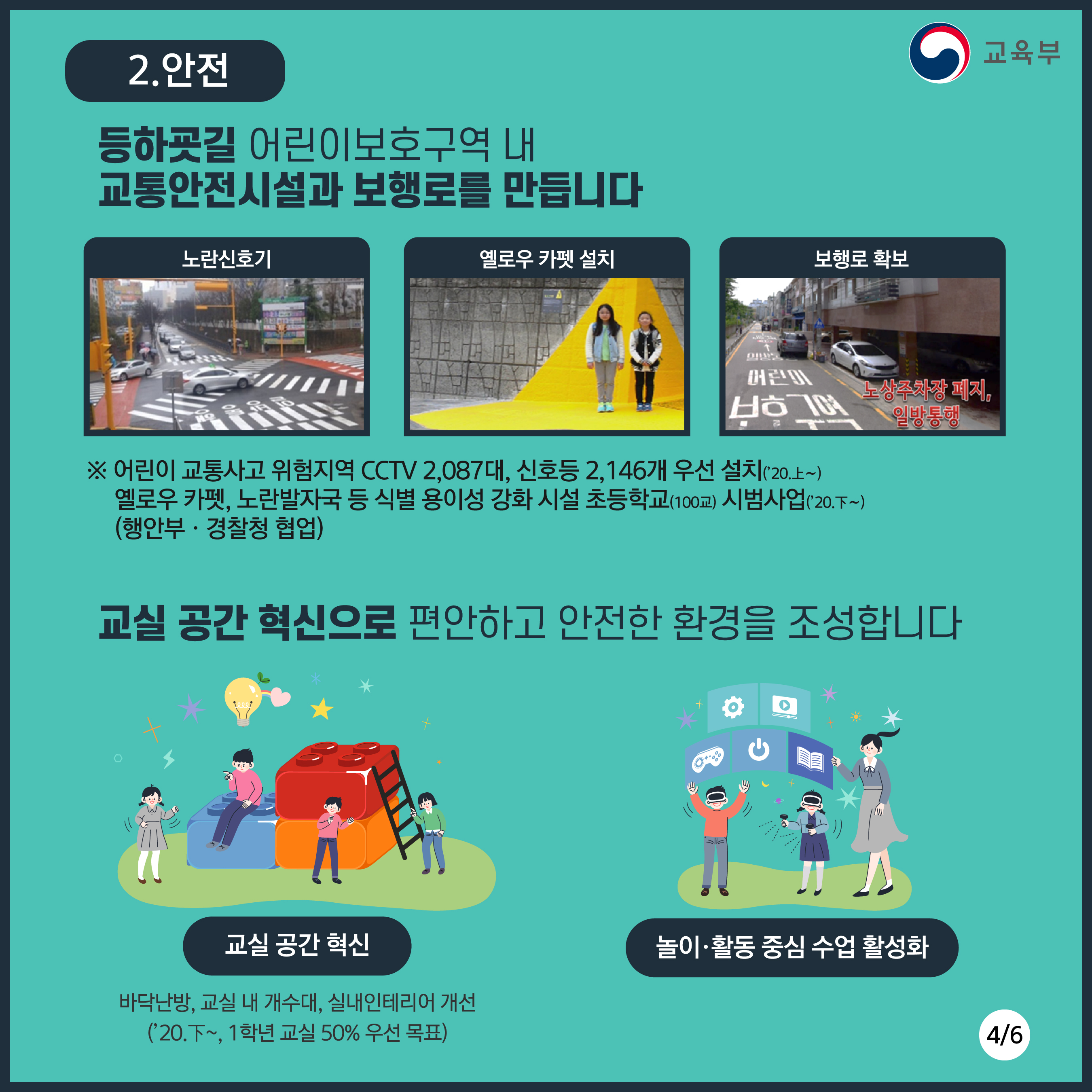 - 등하굣길 어린이보호구역 내 교통안전시설과 보행로를 만듭니다