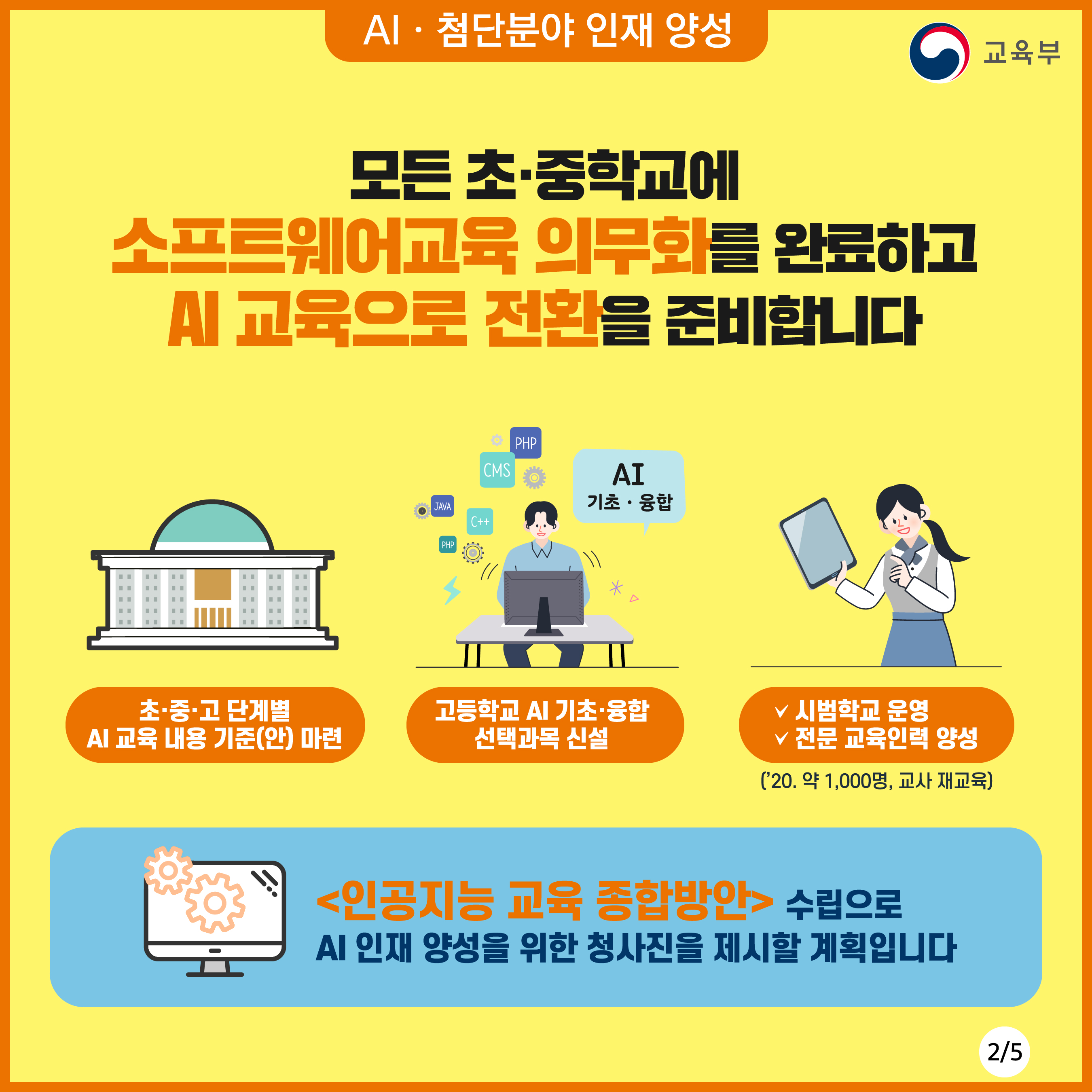 모든 초중학교에 소프트웨어교육 의무화를 완료하고 AI교육으로 전환을 준비합니다.