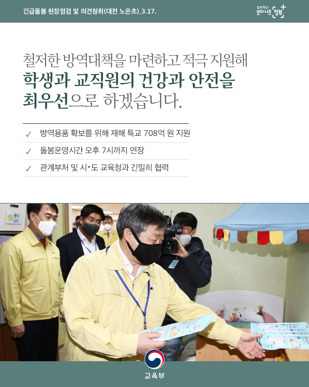 철저한 방역대책을 마련하고 적극 지원해 학생과 교직원의 건강과 안전을 최우선으로 하겠습니다.