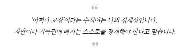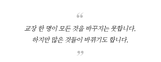 박래광 교장은 교장 공모제를 통해 선출된 1년 차 교장입니다. 30년 동안 평교사로 지내다 교장이 되었다고 블로그 이름도 ‘어쩌다 교장’이라고 합니다. 흔치않은 과정을 통해 교장이 된 만큼 구성원들과 같은 눈높이에서 소통하고 사소한 조직문화부터 바꾸려는 노력들을 쉽게 엿볼 수 있었습니다.