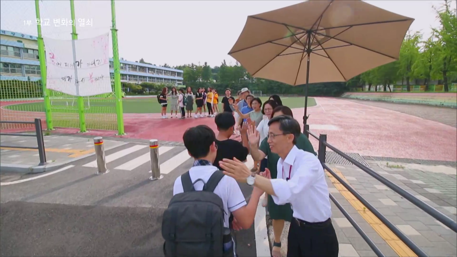 덕양 중학교의 등굣길은 여느 학교와 달라 보입니다. 이준원 교장이 직접 교문 앞에 나와 일일이 학생과 등교 하이파이브를 합니다. 전교생이 함께 하는 교문맞이 이벤트로 이준원 교장이 부임한 후 8년 동안 매일같이 해오던 일입니다.