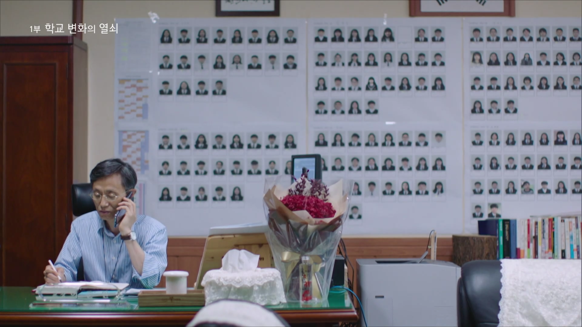 항상 아이들에 대한 진정성 있는 관심을 강조하는 이준원 교장실 벽면에는 행여 학생들의 얼굴과 이름을 잊을까 전교생의 사진을 크게 출력해 붙여놨습니다.