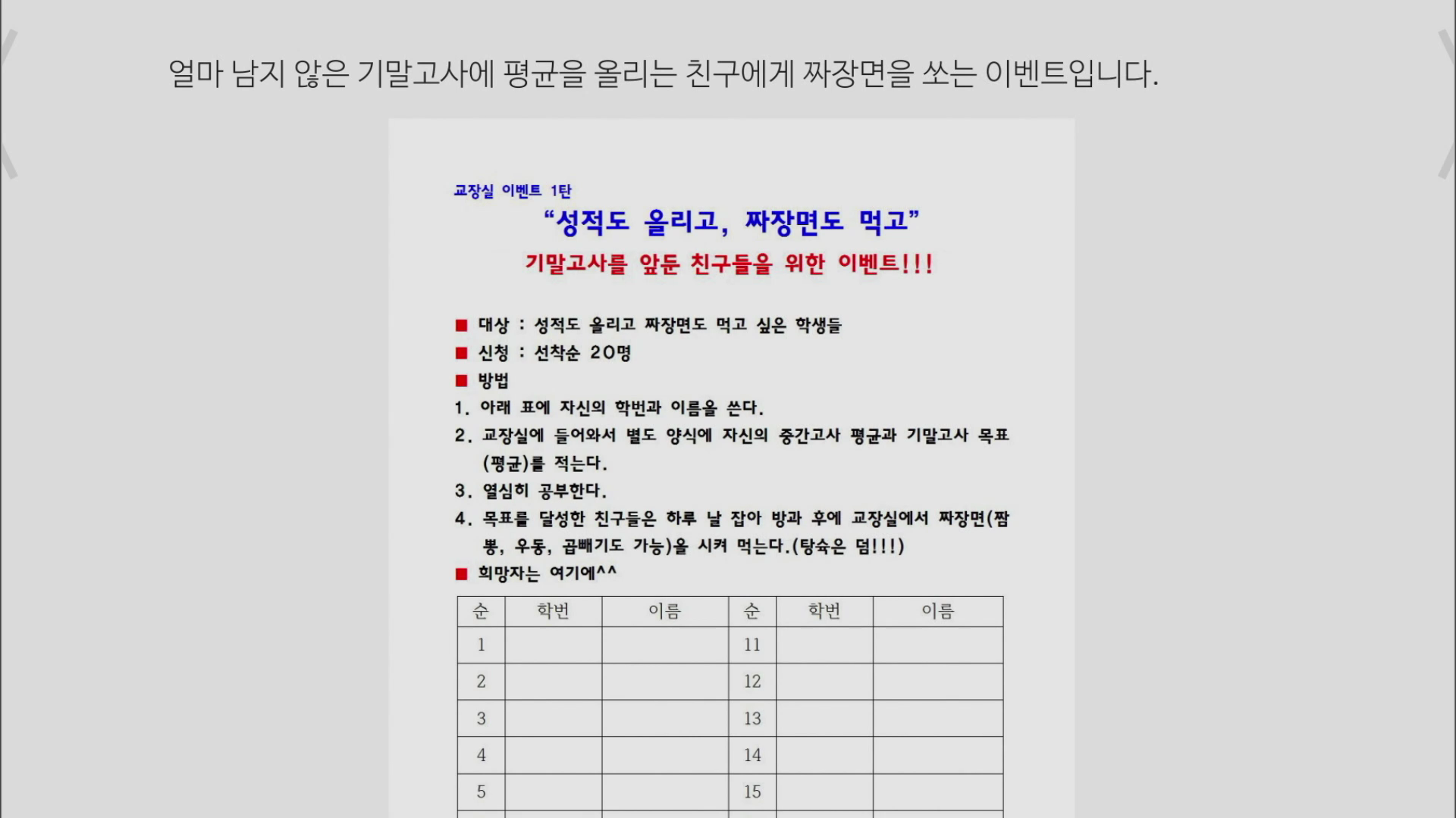 기말고사를 앞두고 학생들을 대상으로 자장면 이벤트를 열어 교장실에서 함께 자장면을 먹으며 학생들이 원하는 교육과정에 대해 솔직한 이야기를 나누기도 합니다. 교장실 옆에는 학생들이 직접 학교의 건의 사항이나 다양한 이야기를 남길 수 있는 게시판도 설치했습니다. 건의 게시판에는 단순히 학생들의 요구 사항만 있는 것이 아닙니다. 교장선생님이 직접 답변을 달아주고 필요한 경우 교사들에게 직접 전달해 개선방향을 찾아 공지합니다.