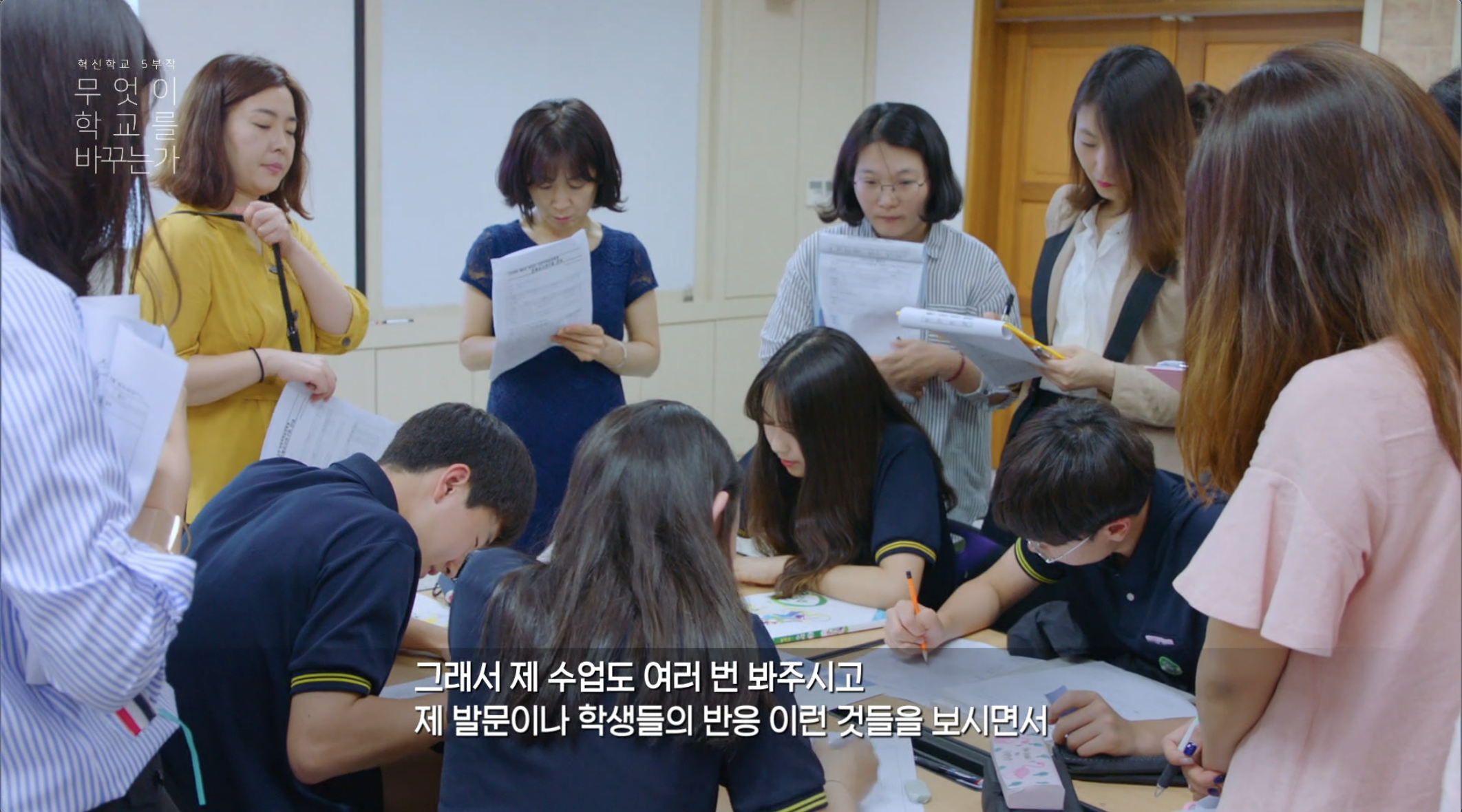 특별한 이벤트로 꾸며지지 않은 일상적인 수업을 동료 교사들에게 보여주고, 수업에 참관한 선생님들은 동료 교사를 보는 것이 아닌 그들의 눈은 학생들에게 향해 있습니다. 동료 교사의 수업 기술보다는 아이들이 언제 수업에서 멀어지고 또 어느 순간에 몰입하는지 학생들의 변화를 열심히 관찰합니다.