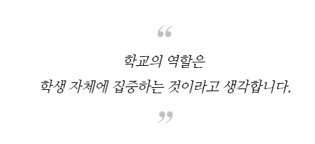 아이들은 각자 다른 재능과 다른 능력, 다른 꿈과 다른 미래를 가지고 있습니다. 아이들 하나하나가 가지고 있는 각자의 색깔을 빛나게 하고 아이들이 바라보는 미래로 나아가게 하는 것, 그것이 학교가 나아가야 하는 방향은 아닐까요?