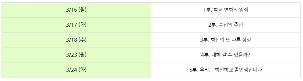 다음 주 월요일(3.23) 밤 9시 50분에는 <무엇이 학교를 바꾸는가> 네 번째 이야기 ‘대학 갈 수 있을까?’편이 방송됩니다. 성적 줄 세우기보다는 학생 하나하나를 살피는 교육을 앞세우는 혁신학교의 철학이 대학입시라는 거대한 장애물을 어떻게 극복하는지에 대한 이야기가 다뤄집니다. 더 많은 이야기가 궁금하다면, EBS 9시 50분 본 방송을 시청해 보세요.