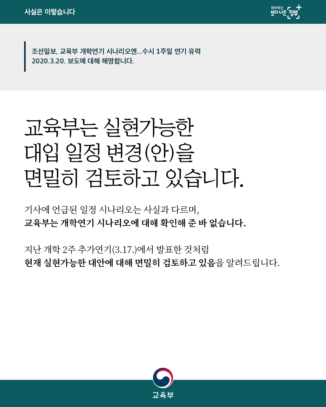 교육부는 실현가능한 대입일정을 제시하기 위해 대입일정변경(안)을 면밀히 검토하고 있습니다. 본문
