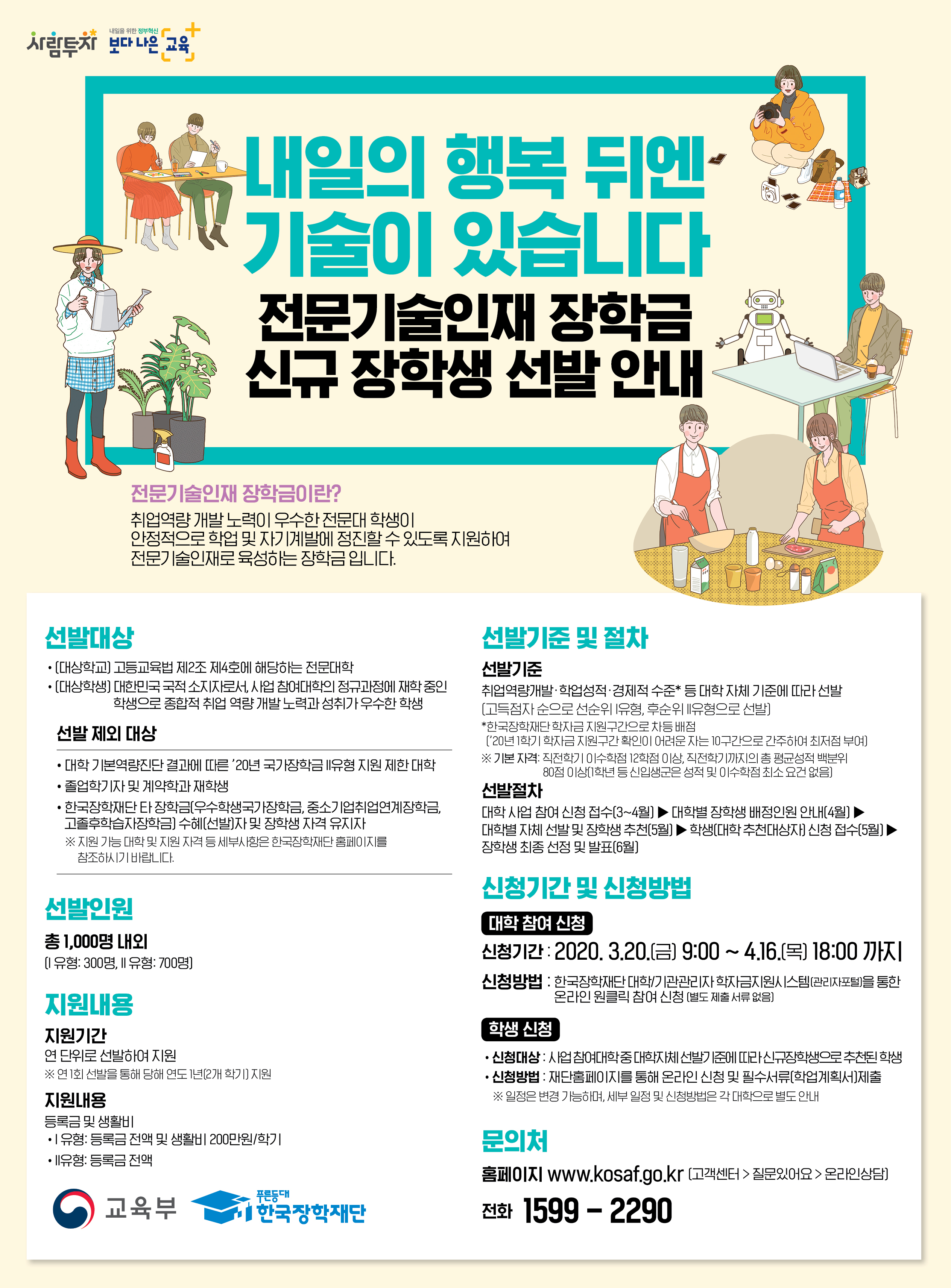 교육부(부총리 겸 교육부장관 유은혜)와 한국장학재단(이사장 이정우)은 2020년도 전문대학 ‘전문기술인재’ 우수학생 국가장학사업 지원계획을 발표하였다.
