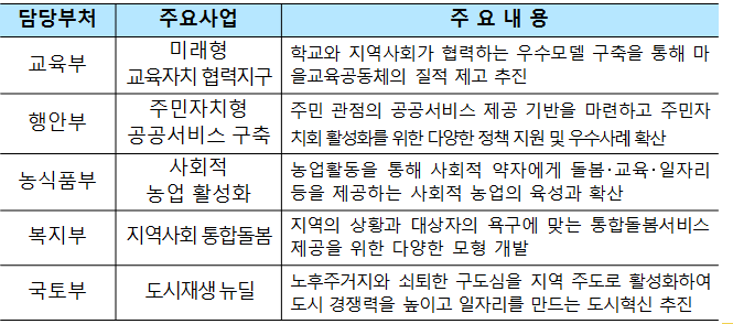5개 부처는 이번 업무협약에서 ▲부처 간 사업 연계 ▲협력사업 추진 및 협업과제 발굴 ▲주민 주도의 지역사업 추진 기반 마련 ▲ 주요 성과와 우수사례 홍보‧확산 등에 긴밀히 협력하기로 했다. 이를 통해, 지역에 필요한 공공서비스를 집약·효율적으로 제공함으로써 인구감소 등으로 인한 주민들의 생활 불편을 해소하고, 지역공동체 활력을 제고하는 데 도움이 될 것으로 기대된다.