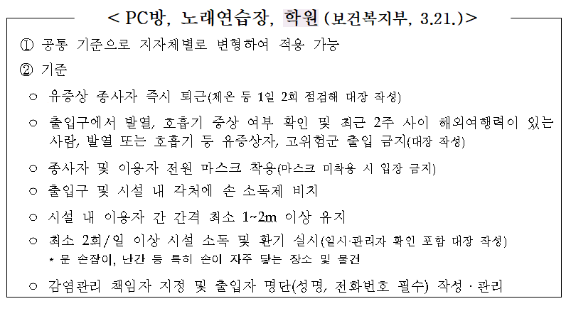 지난 토요일(3.21.) 국무총리 담화에 따르면, 보건복지부장관 명의의 행정명령으로 종교시설 등에 대한 한시적 운영제한 조치를 하면서, 학원·PC방·노래방도 지자체별 상황에 따라 적용대상에 포함될 수 있도록 하였다. 현재까지 전북도청(3.22.)과 서울시청(3.23.), 경기도청(3.24.) 등이 학원을 포함한 다중이용시설을 ‘제한적 허용 시설’로 지정하였다.