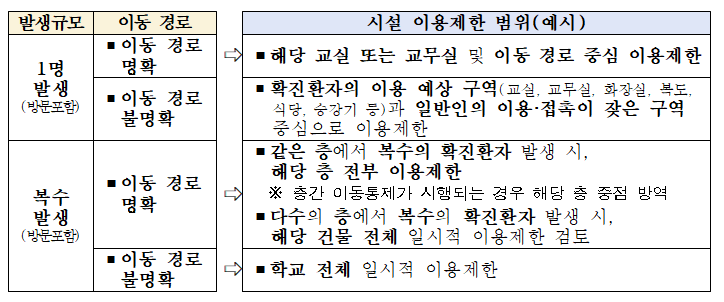 - 학교장은 보건당국의 안내에 따라 시설의 일시적 이용제한 및 출입금지, 시설 내 이동제한 등 조치 시행