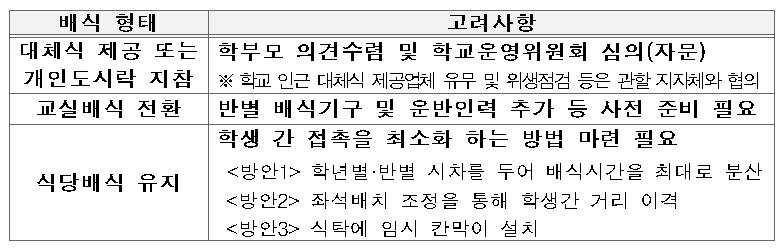 ※ (학교 급식) 학교별 여건을 고려하여 접촉을 최소화 할 수 있는 방법 결정