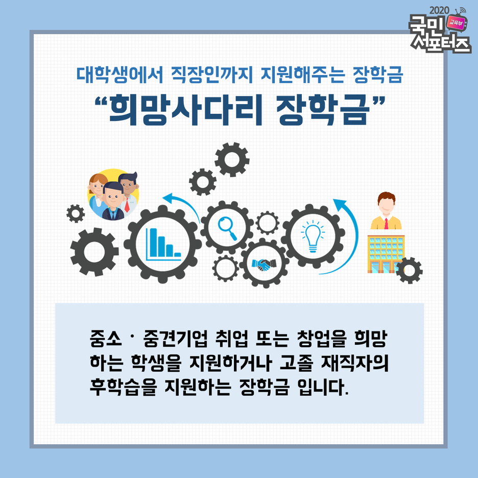 중소·중견기업 취업 또는 창업을 희망하는 학생을 지원하거나 고졸 재직자의 후학습을 지원하는 장학금이 바로 희망사다리 장학금인데요. 기업 인력수요와 고학력 구직자 간 미스매치 완화를 위해