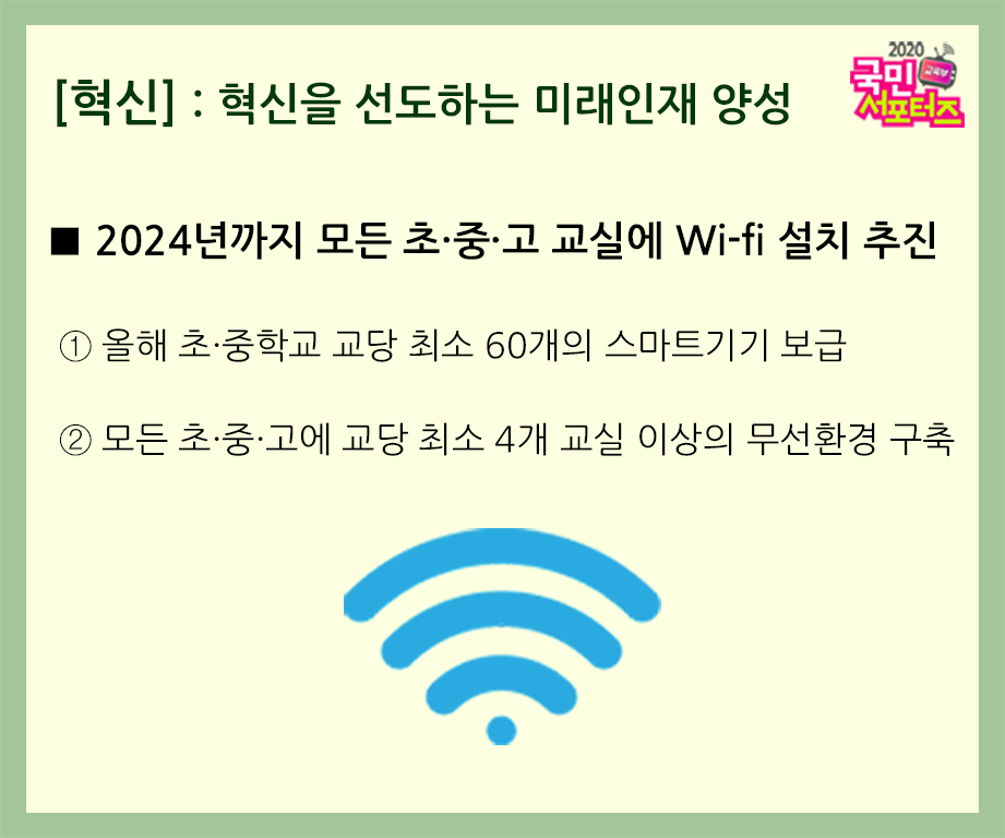 교육부는 또한 AI 교육 등을 위한 미래형 학교의 기반을 구축하기 위해 오는 2024년까지 모든 초·중·고 교실에 Wi-fi(기가급 무선망)을 설치할 예정입니다. 이를 위해 우선적으로 올해는 초·중학교 교당 최소 60개의 스마트 기기를 보급하고, 모든 초·중·고에 교당 최소 4개 교실 이상의 무선 환경 구축을 완료할 계획입니다.