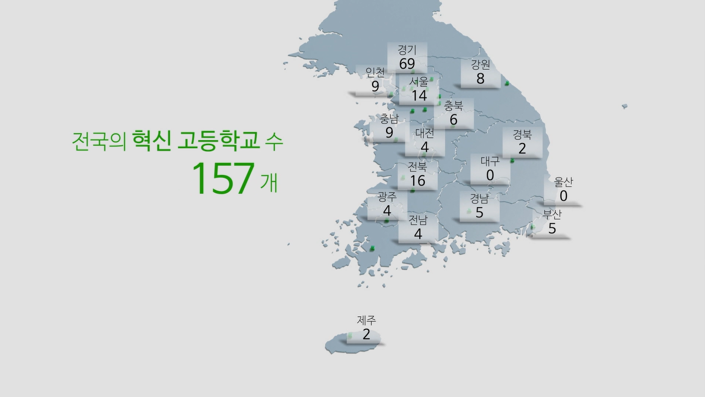 대한민국의 성적 지상주의에서 벗어나겠다는 혁신학교는 2009년에 시작돼 올해로 11년이 되었습니다. 혁신학교의 수는 2019년 기준, 전국 1,714개인데요. 대부분이 초, 중학교로 고등학교는 전체 10%도 되지 않는 157개교입니다. 게다가 최고의 교육지구로 불리는 강남구에는 혁신고등학교가 단 한 개도 없습니다.