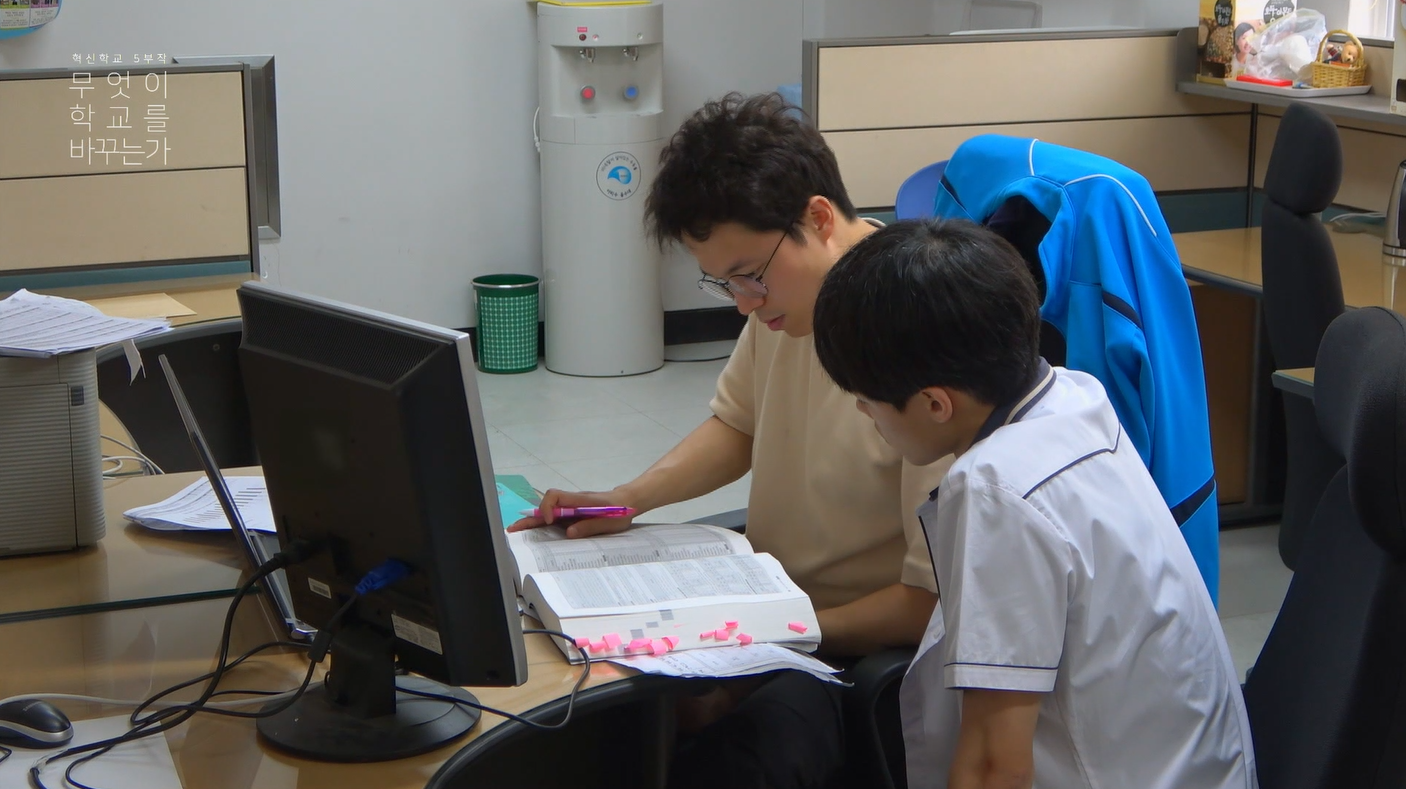 수능이 어느새 코앞으로 다가오면서 담임교사는 목표가 정해진 학생들의 자기 소개서를 꼼꼼히 검토하고 좀 더 인상적인 자기소개서를 작성할 수 있도록 도와줍니다. 혁신 학교의 철학은 목표가 정해지지 않은, 혹은 목표에 못 미치는 학생들도 포기하거나 소홀히 하지 않는다는 것인데요. 단점보다는 장점을 파악하고 그에 맞는 진학지도를 합니다.