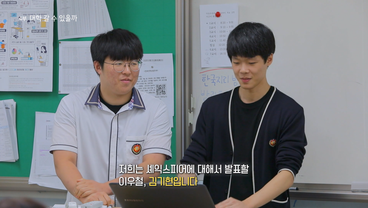 국어시간, 진로탐색 활동 중 하나로 학생들이 조를 이뤄 연극 대본을 쓰고 있는데요. 실제로 자신의 진로를 선택하면서 겪은 과정을 소재로 연극을 기획하는 활동입니다. 처음에는 별 부담 없이 시작한 공연이지만 서로의 고민과 경험이 대본이 되고 연기까지 하다 보니 학생들은 자연스럽게 자신에게 맞는 진로를 찾기 위해 어떤 노력을 해야 하는지 깨닫게 됩니다.