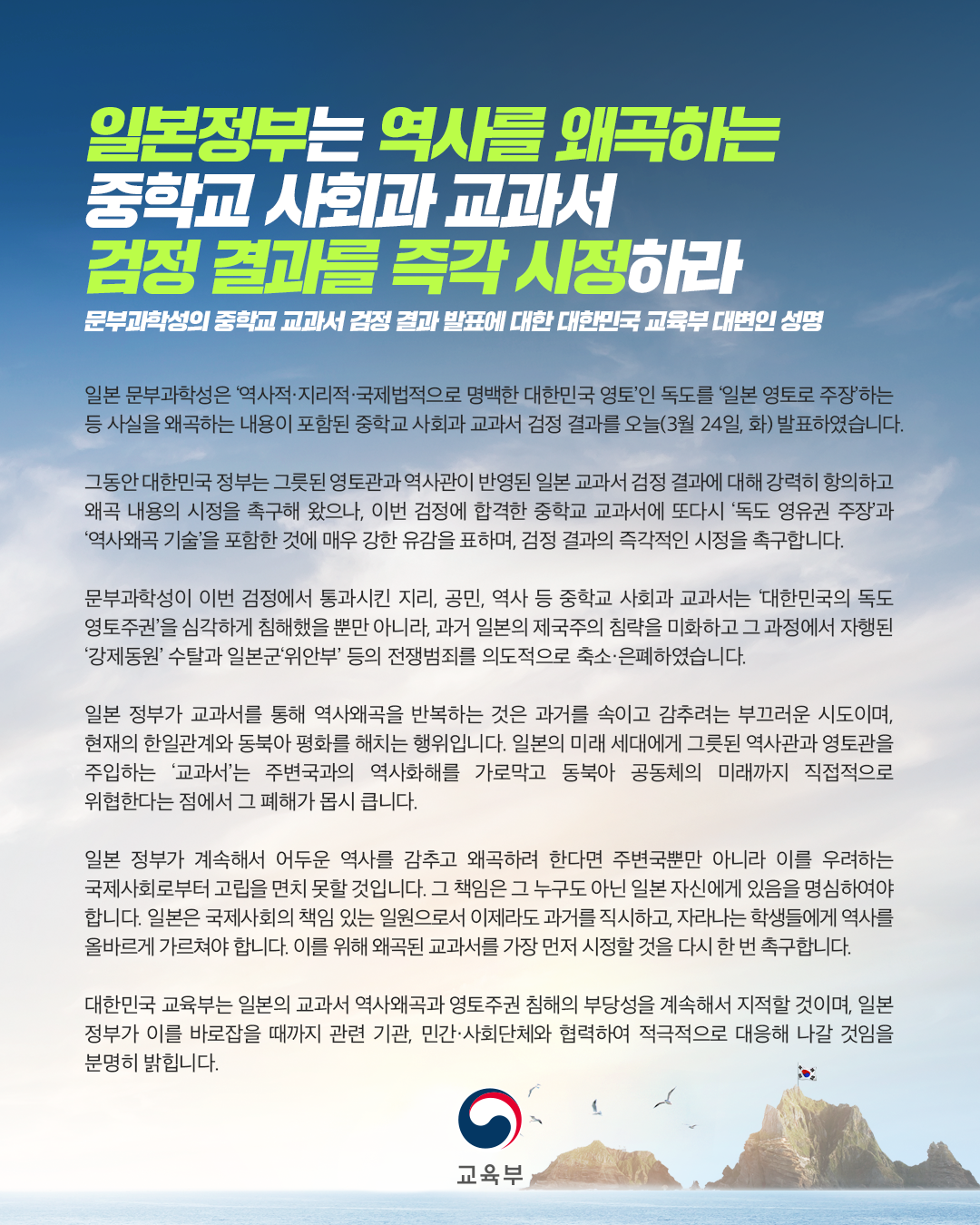 교육부는 역사를 왜곡하고 영토 주권을 침해하는 일본의 시도에 대해 적극 대응하겠습니다 본문