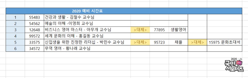 엑셀 파일에 과목 번호와 과목명, 교수명 등을 정리해놓으면 수강 신청 당일에 많은 시간을 절약할 수 있습니다.