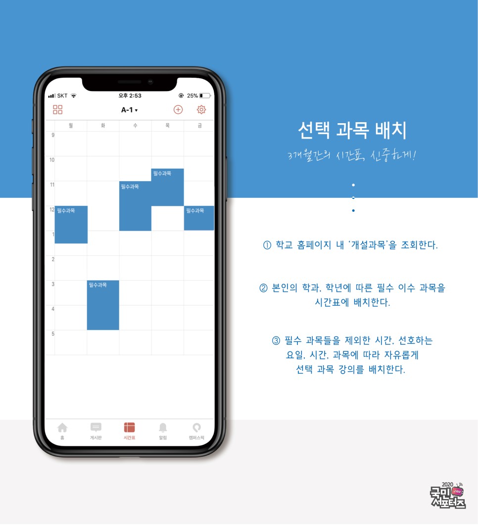 이 중, 가장 첫 번째로 고려해야 할 점은 전공 필수, 교양 필수 등 ‘필수 이수 과목’입니다. 각 학과, 학년에 따른 필수 이수 과목을 시간표에 먼저 배치한 후, 적성이나 취향에 따른 선택 과목들을 추가로 배치합니다.