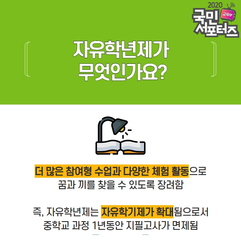 중학교 과정 3년 중에서 한 학기 동안 학생들이 중간고사와 기말고사 등의 지필 고사를 보지 않고, 스스로 꿈과 끼를 찾을 수 있도록 동아리, 예술, 체육 등 다양한 활동을 체험할 수 있는 제도죠. 시험 대신 독서토론, 역할극, 진로체험 및 프로젝트 등 참여형 수업에 참여해 다양한 체험 활동이나 진로 탐색이 가능하답니다.